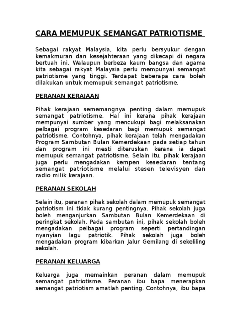 Oleh itu jelaslah bahawa pihak. Sebenarnya terdapat banyak cara yang boleh dijalankan untuk memupuk semangat patriotik dalam kalangan masyarakat di negara kita. Kepentingan semangat patriotisme dan cara mewujudkannya.