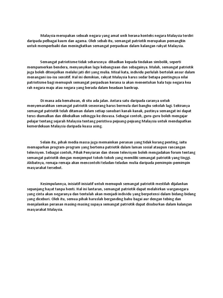 Up to 24 cash back Contoh Karangan A SPM DAN PT3. Program yang seperti kawad kaki dan latihan berkumpulan dapat memupuk semangat patriotik kepada mereka ke arah cinta akan negara. Cara Memupuk Semangat Patriotisme Dalam Kalangan Remaja.