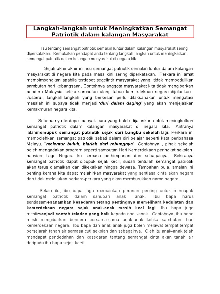 Contoh 2 Langkah Memupuk Semangat Patriotisme. Langkah-langkah Memupuk Semangat Patriotik Oleh. Karangan 1 usaha memupuk semangat patriotisme.